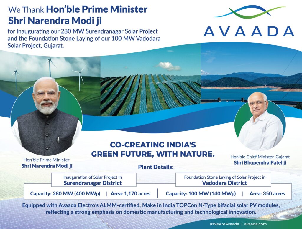 AHMEDABAD, September 23: ઉર્જાક્ષેત્રે અગ્રણી સમૂહ અવાદા ગ્રૂપે ગુજરાતના સુરેન્દ્રનગર ખાતે તેના 280 મેગાવોટ સોલર પાવર પ્રોજેક્ટના ઉદઘાટન સાથે સસ્ટેનેબલ એનર્જી ટ્રાન્સફોર્મેશનની દિશામાં વધુ એક નોંધપાત્ર સીમાચિહ્ન હાંસલ કર્યું છે. આ પ્રોજેક્ટનો ઔપચારિક ઉદઘાટન પ્રધાનમંત્રી નરેન્દ્ર મોદીજીએ કર્યું હતું, જે ભારતમાં ક્લિન એનર્જી ટ્રાન્ઝિશનને વેગ આપવા તથા આત્મનિર્ભર ભારતના વિઝનને મજબૂત કરવાની સરકારની કટીબદ્ધતા દર્શાવે છે.