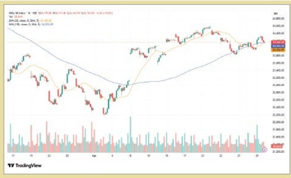 29 એપ્રિલના રોજ નિફ્ટી વધારા સાથે પાછો ફર્યો, પરંતુ આગામી સત્રોમાં તેજીને લંબાવવા માટે તેને વધુ સહાયક પરિબળોની જરૂર છે. મોમેન્ટમ ઇન્ડિકેટર્સ સંપૂર્ણપણે સહાયક નથી, અને છેલ્લા પાંચ સત્રોમાં નિફ્ટી 50-દિવસના EMAથી ઉપર રહેવામાં નિષ્ફળ ગયો છે. દરમિયાન, ટ્રમ્પ ઇરાન પરમાણુ કરાર પર સંમત ન થાય ત્યાં સુધી હોર્મુઝ નાકાબંધી પર અડગ રહ્યા હોવાથી તેલના ભાવ $110 પ્રતિ બેરલથી ઉપર વધ્યા. ફેડ મીટિંગના પરિણામ પહેલા પણ સાવધાની પ્રવર્તી હતી, જેમાં દરો પર યથાવત સ્થિતિ જાળવી રાખવામાં આવી હતી. નિફ્ટીએ 24,500-24,600 તરફની તેજી માટે 24,350થી ઉપર સ્કેલ અને ટકાવી રાખવાની જરૂર છે. ત્યાં સુધી, કોન્સોલિડેશન ચાલુ રહી શકે છે, તાત્કાલિક સપોર્ટ 24,000-23,950 પર રહેશે; નિષ્ણાતોના મતે, આ ઝોનથી નીચે આવવાથી 23,800 માટેનો દરવાજો ખુલી શકે છે.