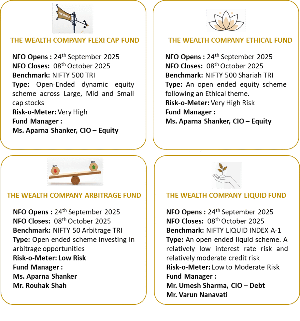 ચાર ફંડ્સ જેમાં ધ વેલ્થ કંપની ફ્લેક્સી કેપ ફંડ, ધ વેલ્થ કંપની આર્બિટ્રેજ ફંડ, ધ વેલ્થ કંપની એથિકલ ફંડ અને ધ વેલ્થ કંપની લિક્વિડ ફંડ વૃદ્ધિ, સ્થિરતા, નૈતિકતા અને તરલતામાં રોકાણકારોની વિવિધ જરૂરિયાતોને પહોંચી વળવા માટે બનાવવામાં આવ્યા છે. સાથે મળીને તે એક વ્યાપક શરૂઆત કરે છે જે સંસ્થાકીય ધોરણના અનુપાલન, સાયન્ટિફિક રિસ્ક ફ્રેમવર્ક્સ અને ડિસ્ટ્રીબ્યુટર-ફર્સ્ટ ઇકોસિસ્ટમનું મિશ્રણ કરે છે.