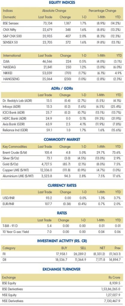 વ્યાપક બજારોએ મુખ્ય ઇન્ડાઇસિસ કરતાં વધુ સારું પ્રદર્શન કર્યું, જેમાં નિફ્ટી મિડકેપ ઇન્ડેક્સમાં 2.2 ટકાનો ઉમેરો થયો અને સ્મોલકેપ ઇન્ડેક્સમાં 3.3%નો વધારો થયો. નિફ્ટીમાં ઇન્ટરગ્લોબ એવિએશન, અદાણી પોર્ટ્સ, અદાણી એન્ટરપ્રાઇઝ, ટ્રેન્ટ, ભારત ઇલેક્ટ્રોનિક્સ સૌથી વધુ વધ્યા હતા, જ્યારે ઘટેલાં શેર્સમાં ડૉ. રેડ્ડીઝ લેબ્સ, HDFC લાઇફ, સિપ્લા, NTPC, સન ફાર્માનો સમાવેશ થાય છે. ફાર્મા (1% નીચે) સિવાય, અન્ય તમામ સેક્ટોરલ ઇન્ડાઇસિસ સુધરીને બંધ થયા હતા જેમાં ડિફેન્સ ઇન્ડેક્સ 5%થી વધુ વધ્યો હતો, કેપિટલ ગુડ્સ, મીડિયા, PSU બેંક ઇન્ડાઇસિસ 3% વધ્યા હતા, જ્યારે ઓટો, કન્ઝ્યુમર ડ્યુરેબલ્સ, IT, મેટલ, રિયલ્ટી, FMCG, ટેલિકોમ, ખાનગી બેંક ઇન્ડાઇસિસ 1-2% વધ્યા હતા.