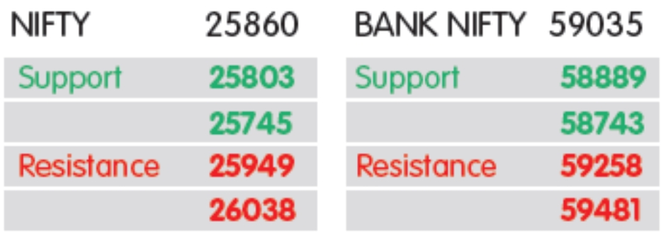 દરમિયાનમાં નિષ્ણાતોના જણાવ્યા અનુસાર બજારમાં મંદીનો માહોલ પ્રવર્તતો હોય તેવું લાગે છે, કારણ કે બેન્ચમાર્ક નિફ્ટી ટૂંકા ગાળાની મૂવિંગ એવરેજથી નીચે આવી ગયો છે, લોઅર હાઇ- લોઅર લો માળખાને ચાલુ રાખીને જો નિફ્ટી 25,800 (તાત્કાલિક સપોર્ટ)ને બચાવવામાં નિષ્ફળ જાય, તો 25,700 એ જોવાનું લેવલ છે. જોકે, હાયર લેવલે, 26,050–26,100 રેઝિસ્ટન્સ તરીકે કામ કરે તેવી અપેક્ષા છે. દરમિયાન, બેંક નિફ્ટીને 59,500–59,800 તરફ પાછા ફરવા માટે 58,800 (ગયા અઠવાડિયાના લોઅર લેવલના તાત્કાલિક સપોર્ટ) ને બચાવવાની જરૂર છે, પરંતુ નિષ્ણાતોએ જણાવ્યું હતું કે તેનાથી નીચે જવાથી 58,650–58,500 માટેનો દરવાજો ખુલી શકે છે.