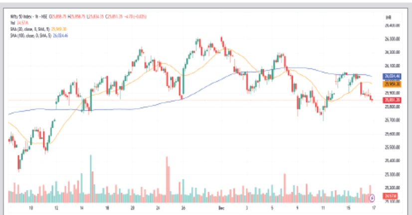 16 ડિસેમ્બરના રોજ, નિફ્ટી 167 પોઈન્ટ (0.64 ટકા) ઘટીને 25,860 પર બંધ રહ્યો હતો, જ્યારે બેંક નિફ્ટી 427 પોઈન્ટ (0.72 ટકા) ઘટીને 59,035 પર બંધ રહ્યો હતો. માર્કેટ બ્રેડ્થમાં મંદીનું પ્રભુત્વ હતું, જેમાં NSE પર 881 વધતા શેર સામે લગભગ 1,956 શેર ઘટ્યા હતા.
