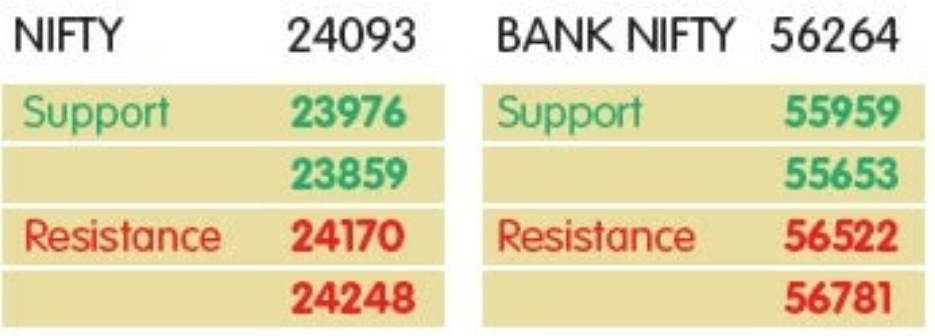 નિફ્ટીને 24,200–24,300 ઝોનમાં રેઝિસ્ટન્સનો સામનો કરવો પડે તેવી શક્યતા છે, કારણ કે તેનાથી ઉપર એક નિર્ણાયક ચાલ 24,500–24,600 માટે દરવાજા ખોલી શકે છે, જે એક મહત્વપૂર્ણ રેઝિસ્ટન્સ છે. નેગેટિવ બાજુએ, 24,000–23,950 તાત્કાલિક સપોર્ટ ઝોન હોવાની શક્યતા છે.