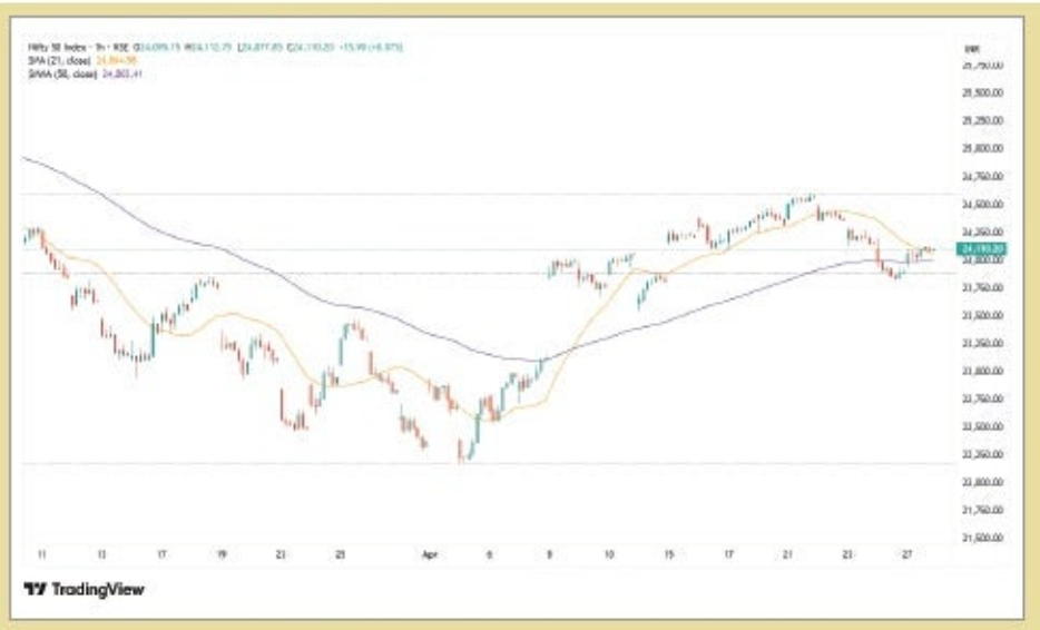 અમદાવાદ, 28 એપ્રિલઃ વધતાં જતાં ક્રૂડના ભાવ, જિયો પોલિટિકલ ક્રાઇસિસ તેમજ વૈશ્વિક શેરબજારોમાં અવઢવની સ્થિતિ વચ્ચે ગીફ્ટ નિફ્ટી 24000 પોઇન્ટના સાયકોલોજિકલ લેવલની નીચે નેગેટિવ ટ્રેડ થઇ રહ્યો છે. તે જોતાં ટેકનિકલ એનાલિસ્ટ્સ અને બજાર નિષ્ણાતો એવો મત ધરાવે છે કે, નિફ્ટીએ તેના ત્રણ દિવસના ઘટાડાને તોડી નાખ્યો અને માસિક F&O સમાપ્તિ સત્રના એક દિવસ પહેલા 27 એપ્રિલના રોજ 0.8 ટકાના વધારા સાથે પાછો ફર્યો. બુલિશ કેન્ડલનું નિર્માણ, નિફ્ટી ટૂંકા ગાળાના મૂવિંગ એવરેજથી ઉપર પાછો ફરે છે અને હાયર હાઇ હાયર લો પેટર્નની સંભાવના ચાલુ રહે છે, આગામી સત્રોમાં વધુ પુલબેક રેલીની શક્યતા વધારે છે, જો નિફ્ટી 23,950થી ઉપર રહે અને VIX વધુ ઘટે તેવી શક્યતા છે. જો નિફ્ટી તેની રેલી લંબાવશે, તો નજીકના ગાળામાં 24,200–24,300 ઝોન જોવા માટેના મુખ્ય લેવલ્સ હશે, ત્યારબાદ 24,500–24,600 એક મહત્વપૂર્ણ રેઝિસ્ટન્સ ઝોન તરીકે આવશે. નિષ્ણાતોના મતે, નુકસાનની બાજુમાં, તાત્કાલિક સપોર્ટ 23,950 પર મૂકવામાં આવ્યો છે, ત્યારબાદ 23,800 મુખ્ય સપોર્ટ લેવલ તરીકે છે.