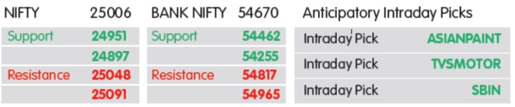નિફ્ટી માટે આગામી સત્રોમાં 25,000ના સ્તરથી ઉપર ટકી રહેવું એ 25,200-25,250 ઝોન પર તાત્કાલિક અવરોધ તરફના અપટ્રેન્ડ માટે મહત્વપૂર્ણ છે, ત્યારબાદ 25,500 આવે છે. નકારાત્મક બાજુ પર, Nifty માટે તાત્કાલિક મુખ્ય સપોર્ટ 24,900-24,800ના લેવલ પર જણાય છે.