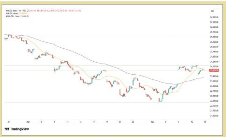 13 એપ્રિલના રોજ ગેપ-ડાઉન ઓપનિંગ પછી (જોકે બજાર નીચું બંધ થયું હતું) દિવસના લોઅર લેવલથી જોવા મળેલી ઝડપી રિકવરી આગામી સત્રોમાં ચાલુ રહેવાની અપેક્ષા છે, કારણ કે પોઝિટિવ મોમેન્ટમ ઉન્ડિકેટર્સ સાથે સ્વસ્થ નજીકના ગાળાના ટેકનિકલ સેટઅપ અને ટૂંક સમયમાં યુએસ-ઈરાન શાંતિ વાટાઘાટોના બીજા રાઉન્ડની નવી આશા છે, નિષ્ણાતોના મતે. જો આ સાચું પડે, તો નિફ્ટી 24000- 24200 (સાયકોલોજિકલ અને 50-દિવસના EMA ની નજીક) પર તાત્કાલિક રેઝિસ્ટન્સનો સામનો કરી શકે છે. આનાથી ઉપર, 24400 24500 એ ધ્યાનમાં રાખવા લાયક લેવલ્સ છે. જોકે, 23700- 23500 મુખ્ય સપોર્ટ ઝોન છે. દરમિયાન, બેંક નિફ્ટી 56200- 56700 તરફ કૂચ કરી શકે છે, જેમાં 54600 ઝોન પર તાત્કાલિક મુખ્ય સપોર્ટ રહેશે.