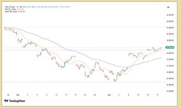 અમદાવાદ, 20 એપ્રિલઃ સંભવિત યુએસ-ઈરાન વાટાઘાટોની વધતી આશા વચ્ચે 17 એપ્રિલના રોજ નિફ્ટી 50 0.65 ટકાના વધારા સાથે પાછો ફર્યો હતો, પરંતુ તે 24,400 ઝોનના પાછલા દિવસના હાયર લેવલથી ઉપર બંધ થઈ શક્યો ન હતો. આ લેવલ એક મહત્વપૂર્ણ રેઝિસ્ટન્સ છે અને 9 માર્ચથી મોટા મંદીવાળા ગેપની ઉપલી શ્રેણીને પણ અનુરૂપ છે. હોર્મુઝ સ્ટ્રેટ એક મહત્વપૂર્ણ પરિબળ છે, જેને તેલના ભાવમાં કરેક્શન અને ટકાઉ બજાર તેજી માટે કાયમી ધોરણે ખોલવાની જરૂર છે. 24,700–24,800 (100- અને 200-દિવસના EMA) તરફ વધુ ઉપરની સફર માટે, નિફ્ટીએ 24,400ની ઉપર એક ખાતરીકારક અને સતત બંધ પહોંચાડવો આવશ્યક છે. દરમિયાન, નજીકના ગાળામાં તેજીનું વલણ યથાવત રહે છે કારણ કે નિફ્ટી 10- અને 20-દિવસના EMAs થી ઉપર ટ્રેડ કરી રહ્યો છે, જેને સ્વસ્થ મોમેન્ટમ ઇન્ડિકેટર્સ અને નબળા VIX દ્વારા ટેકો આપવામાં આવ્યો છે. નિષ્ણાતોના મતે, તાત્કાલિક સપોર્ટ 24,100 પર મૂકવામાં આવ્યો છે, ત્યારબાદ 23,900 એક મહત્વપૂર્ણ સ્તર છે.