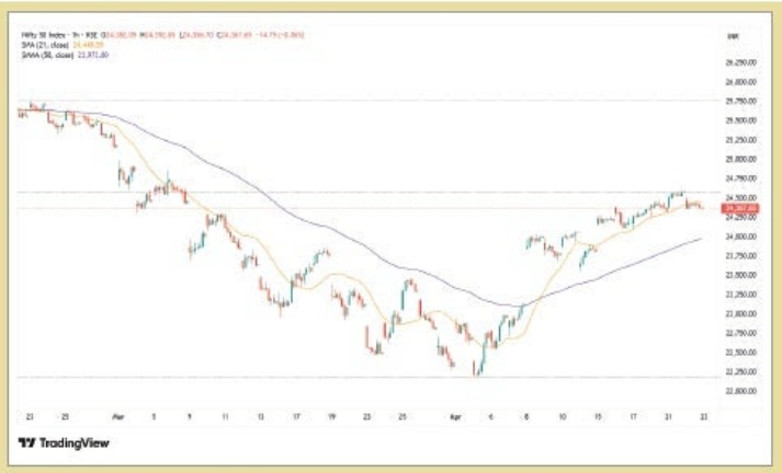 નિફ્ટીએ તેની ત્રણ દિવસની જીતનો સિલસિલો તોડી નાખ્યો અને 22 એપ્રિલના રોજ 0.8 ટકા નીચા સ્તરે બંધ થયો. ટેકનિકલ સેટઅપ સૂચવે છે કે નજીકના ગાળાના ટ્રેન્ડમાં ઘટાડો થયો છે, જોકે વ્યાપક સ્ટ્રક્ચર પોઝિટિવ રહે છે. બજારની નજર ઓઇલના ભાવ પર ધ્યાન કેન્દ્રિત કરશે, જે હોર્મુઝ સ્ટ્રેટ બંધ થવાને કારણે અને જળમાર્ગમાં યુએસ નાકાબંધી ચાલુ રહેવાને કારણે ફરીથી $100 પ્રતિ બેરલની આસપાસ ટ્રેડ થઈ રહ્યા છે. તેથી, 24,200 લેવલ (50-દિવસ EMA) પર નજર રાખવી મહત્વપૂર્ણ છે, કારણ કે તેનાથી નીચે આવવાથી નિફ્ટીને 24,100-23,900 ઝોનમાં ખેંચી શકાય છે. જોકે, નિષ્ણાતોના મતે, 24,500-24,600 રેન્જ મુખ્ય રેઝિસ્ટન્સ તરીકે કામ કરે તેવી અપેક્ષા છે, કારણ કે તેનાથી ઉપર જવાથી જ નિફ્ટી 24,800 (200-દિવસ EMA) તરફ આગળ વધી શકે છે.