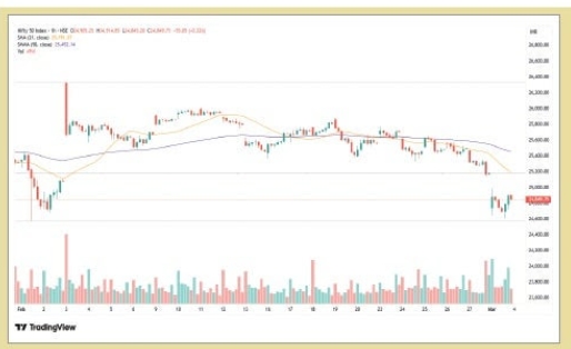 અમદાવાદ, 4 માર્ચઃ નિફ્ટી 2 માર્ચે ગેપ-ડાઉન ઓપનિંગ પછી 1.24 ટકા ઘટ્યો હતો, જોકે, 24,600ની નજીકના દિવસના લોઅર લેવલથી એક ટકાથી વધુ રિકવરી જોવા મળી હતી. મંદીવાળાઓના સંપૂર્ણ પ્રભુત્વને કારણે, ધીમી ગતિ, નબળા ટેકનિકલ સૂચકાંકો અને વૈશ્વિક બજારોમાં વેચવાલીથી પ્રેરિત NIFTY, સોમવારના લોઅર (24,603) અને ઓગસ્ટના લોઅર (24,338)ને તોડે તો મોટા જોખમમાં રહેવાની ધારણા છે. નિષ્ણાતોએ જણાવ્યું હતું કે, આ લેવલ્સથી નીચે, મંદીવાળાઓ 24,000ને લક્ષ્ય બનાવી શકે છે. જોકે, નિષ્ણાતોના મતે, ઉપરની બાજુએ, 25,000 મુખ્ય અવરોધ તરીકે કાર્ય કરે તેવી શક્યતા છે.