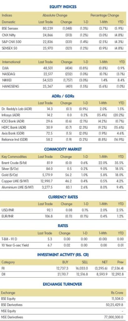 મંગળવારે યુએસ શેરબજારમાં તીવ્ર ઘટાડો થયો હતો. ડાઉ જોન્સ ઇન્ડસ્ટ્રિયલ એવરેજ 403.51 પોઇન્ટ અથવા 0.83% ઘટીને 48,501.27 પર, S&P 500 64.99 પોઇન્ટ અથવા 0.94% ઘટીને 6,816.63 પર અને નાસ્ડેક કમ્પોઝિટ 232.17 પોઇન્ટ અથવા 1.02% ઘટીને 22,516.69 પર બંધ રહ્યો હતો. GIFT NIFTY પરના ઘટાડા વ્યાપક ભારતીય બજાર માટે નબળી શરૂઆતનો સંકેત આપે છે, જેમાં NIFTY 552 પોઇન્ટ અથવા 2.21 ટકા નીચે છે. નિફ્ટી ફ્યુચર્સ 24,447ના લેવલની આસપાસ ટ્રેડ કરી રહ્યા હતા. જે વધેલા જિયોપોલિટિકલ પ્રેશર અને નબળા વૈશ્વિક સંકેતોને પ્રતિબિંબિત કરે છે.