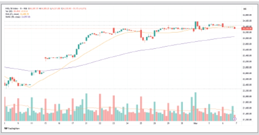 NIFTY અને બેંક NIFTY દબાણ હેઠળ હતા, જેમાં ૬ મેના રોજ બેંક NIFTY વધુ નોંધપાત્ર રીતે સુધારી શક્યા હતા. હળવા કરેક્શન છતાં, NIFTY રેન્જબાઉન્ડ રહ્યો, સતત વધતા ઇન્ડિયા VIX (૧૯ ઝોન સુધી પહોંચવું) વચ્ચે રહેવા સાથે, ભારત-પાકિસ્તાન તણાવને કારણે સાવચેતી દર્શાવે છે. નજીકના ભવિષ્યમાં, વધુ કરેક્શનના કિસ્સામાં NIFTY ૨૪,૨૦૦ પર સપોર્ટ મેળવી શકે છે. ઉપરની બાજુએ, ૨૪,૫૫૦–૨૪,૬૦૦ ઝોન મજબૂત રેઝિસ્ટન્સ તરીકે કાર્ય કરે તેવી અપેક્ષા છે. દરમિયાન, જો પહેલાથી જ નબળો બેંક NIFTY 54,173ના લેવલ (મંગળવારના નીચલા સ્તર)ને બચાવવામાં નિષ્ફળ જાય, તો વધુ વેચાણ દબાણને નકારી શકાય નહીં. જોકે, આ લેવલથી ઉપર રહેવાથી NIFTY 55,000 તરફ જઇ શકે તેવું ટેકનિકલ નિષ્ણાતોએ જણાવ્યું હતું.
