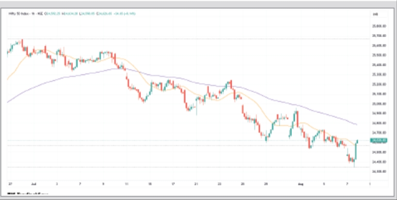 નીચા સ્તરે મજબૂત ખરીદીના રસથી NIFTY દિવસના નીચા લેવલથી 250 પોઈન્ટ રિકવર થયો અને 7 ઓગસ્ટના રોજ સાધારણ સુધારા સાથે બંધ થયો હતો. જોકે, નજીકના ગાળામાં ઘટાડાનો અંદાજ જોતાં, જ્યાં સુધી NIFTY બંધ ધોરણે 24,500–24,400 લેવલ (સપોર્ટ) જાળવી રાખે છે, ત્યાં સુધી 24,700–24,900 તરફ ધીમે ધીમે આગળ વધવાની શક્યતા નકારી શકાય નહીં. જોકે, સપોર્ટ તૂટવાથી ફરીથી ઘટાડાની ચાલ આગળ વધી શકે છે.