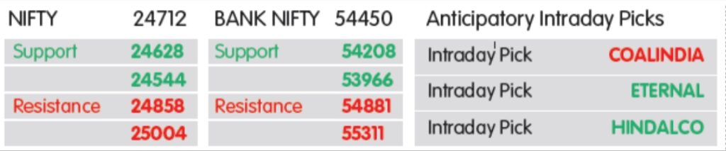 જો નિફ્ટી આગામી સત્રોમાં 100-દિવસના EMA (24,635)ને બચાવવામાં નિષ્ફળ જાય, તો ઓગસ્ટના લોઅર લેવલ(24,337) તરફ ગબડવાની શક્યતા નકારી શકાય નહીં. જોકે, નિષ્ણાતોના મતે, તેનાથી ઉપર રહેવાથી સંભવિત કોન્સોલિડેશન પછી 24,900-25,000 તરફ નવા સ્તરની ઉછાળાની આશા જાગી શકે છે.