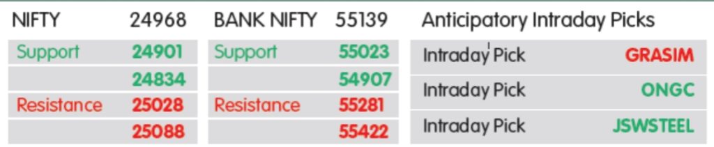 જ્યાં સુધી NIFTY 24,850 પોઇન્ટના (સપોર્ટ)થી ઉપર રહે છે, ત્યાં સુધી 25,000 (તાત્કાલિક રેઝિસ્ટન્સ) તરફ ધીમે ધીમે ઉપર તરફ જવાની શક્યતા છે, ત્યારબાદ આગામી સત્રોમાં 25,150-25,250 રેઝિસ્ટન્સ ઝોન તરફ આગળ વધવું શક્ય છે. જોકે, 24,850 સપોર્ટ લેવલથી નીચે નિર્ણાયક ઘટાડો 24,700 તરફના ઘટાડા માટેનો માર્ગ ખોલી શકે છે.