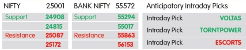 NIFTY 24850-24900 પોઇન્ટના ઝોન પર સપોર્ટ સાથે કોન્સોલિડેટેડ થઈ શકે છે, કારણ કે આની નીચે બ્રેકડાઉનથી વેચવાલી વધી શકે છે. જો કે, જ્યાં સુધી તે આ સપોર્ટ જાળવી રાખે છે, ત્યાં સુધી 25200- 25300ની રેન્જ તરફ કૂચ શક્ય છે. આ એક રેઝિસ્ટન્સ ઝોન તરીકે કાર્ય કરી શકે છે, અને તેનાથી ઉપર બ્રેકડાઉનથી તેજી આવી શકે છે.
