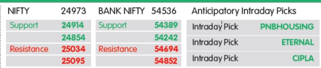 1૦ સપ્ટેમ્બરના રોજ, નિફ્ટી 1૦5 પોઈન્ટ વધીને 24,973 પર પહોંચ્યો હતો, જ્યારે બેંક નિફ્ટી 32૦ પોઈન્ટ વધીને 54,536 પર પહોંચ્યો હતો. માર્કેટબ્રેડ્થ પોઝિટિવ રહેવા સાથે NSE પર ઘટેલા 1,૦83 શેરની સરખામણીમાં લગભગ 1,692 શેરમાં ઘટાડાની ચાલ રહી હતી.