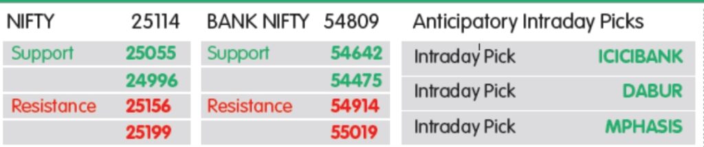 આઠ દિવસની જીતનો સિલસિલો અને તેજીવાળા ટેકનિકલ અને મોમેન્ટમ ઇન્ડિકેટર્સ સાથે, NIFTY આગામી સત્રોમાં 25,250ના રેઝિસ્ટન્સ તરફ આગળ વધવાની અપેક્ષા રાખે છે, ત્યારબાદ 25,૩50 ઝોનમાં આવે છે, જોકે, વચ્ચે-વચ્ચે કોન્સોલિડેશન થવા છતાં. બીજી બાજુ, સપોર્ટ 25,000 પર રાખવામાં આવ્યો છે, ત્યારબાદ 24,800 પર. દરમિયાન, બેંક NIFTYને 55,150–55,૩00 તરફ આગળ વધવા માટે 54,840 (100-દિવસના EMA) ઉપર પાછા ફરવાની અને ટકાવી રાખવાની જરૂર છે. જોકે, નિષ્ણાતોના મતે, 54,650 ને તાત્કાલિક સપોર્ટ ગણી શકાય, ત્યારબાદ 54,450 આવે છે.