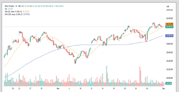 અમદાવાદ, 1 ડિસેમ્બરઃ નિફ્ટીએ 26000 પોઇન્ટની સાયકોલોજિકલ સપાટી જાળવી રાખવા સાથે સાથે 25886 પોઇન્ટની 20 દિવસીય એસએસએ પણ જાળવી છે. આરએસઆઇ 63 આસપાસ બુલિશ મોમન્ટમ દર્શાવે છે. જ્યારે રિલાયન્સ સિક્યુરિટીઝનો ટેકનિકલ રિસર્ચ રિપોર્ટ દર્શાવે છે કે, 26400 પોન્ટની સપાટી ક્રોસ થયા બાદ ઉપરમાં 26800- 27000 પોઇન્ટની જાદૂઇ સપાટીઓ જોવા મળી શકે. ઉપરમાં રેઝિસ્ટન્સ 27200 પોઇન્ટ જણાય છે. તે ક્રોસ થાય તો માર્કેટમાં શોર્ટટર્મ તેજીનો ધમધમાટ જોવા મળી શકે.