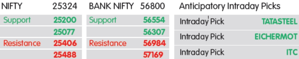 હાયર હાઇ, લોઅર લો પેટર્નની રચના અને મજબૂત મોમેન્ટમ ઇન્ડિકેટર્સ સૂચવે છે કે NIFTY ધીમે ધીમે સપ્ટેમ્બર સ્વિંગ હાઇ, 24,400-24,500 તરફ આગેકૂચ માટે સેટ છે. તે ઉપરાંત, 25,670 એ જોવા માટેનો મહત્વપૂર્ણ રેઝિસ્ટન્સ છે, જે રેકોર્ડ હાઇ માટેનો દરવાજો ખોલી શકે છે. નિષ્ણાતોના મતે, NIFTYમાં ટ્રેન્ડલાઇન બ્રેકઆઉટ (લગભગ 25,380), ત્યારબાદ 25,450 મુખ્ય રેઝિસ્ટન્સ તરીકે જોવાની અપેક્ષા છે – જે જૂન ઉચ્ચ માટેનો દરવાજો ખોલી શકે છે. જોકે, સપોર્ટ 25,150 અને 25,060 પર મૂકવામાં આવ્યો છે.