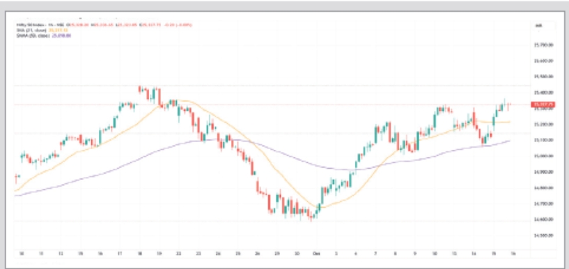 NIFTYએ મજબૂતી મેળવવા સાથે ટેકનિકલી ટ્રેન્ડલાઇન બ્રેકઆઉટ (લગભગ 25,380-25,400), ત્યારબાદ 25,450 મુખ્ય રેઝિસ્ટન્સ તરીકે જોવાની અપેક્ષા છે – જે જૂન ઉચ્ચ માટેનો દરવાજો ખોલી શકે છે. જોકે, સપોર્ટ 25,150 અને 25,060 પર મૂકવામાં આવ્યો છે. દરમિયાન, બેંક NIFTY 57,000ના આંકને સ્પર્શે તેવી શક્યતા છે, ત્યારબાદ તેની રેકોર્ડ ઊંચી સપાટી 57,628 છે. જોકે, 56,200 – જે મંગળવારના નીચા લેવલ અને 10-દિવસના EMA સાથે સુસંગત છે – સપોર્ટ તરીકે કાર્ય કરી શકે છે. 15 ઓક્ટોબરના રોજ, NIFTY 178 પોઈન્ટ (0.71 ટકા) વધીને 25,324 પર પહોંચ્યો, જ્યારે બેંક NIFTY 303 પોઈન્ટ (0.54 ટકા) વધીને 56,800 પર પહોંચ્યો હતો. માર્કેટ બ્રેડ્થ તેજીવાળાઓની તરફેણમાં હતી. 1,045 શેર સામે લગભગ 1,789 શેરમાં ખરીદીનો રસ જોવા મળ્યો જેમાં વેચાણનું દબાણ જોવા મળ્યું.