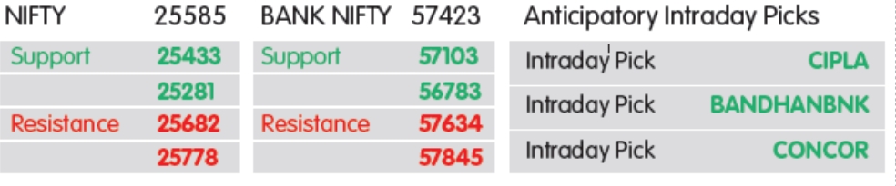તાજેતરની પ્રોફિટ બુકિંગ પછી નિફ્ટીએ વધુ મજબૂતી મેળવી છે. એકંદરે, સંભવિત તૂટક તૂટક કોન્સોલિડેશન છતાં ટ્રેન્ડ પોઝિટિવ રહે છે. નિષ્ણાતોના મતે, ઇન્ડેક્સ ધીમે ધીમે ચાલુ વર્ષના તેના ઉચ્ચ (25,669) સુધી પહોંચવાની અપેક્ષા છે, ત્યારબાદ 26,000 ઝોન આવે છે. જોકે, સપોર્ટ 25,400–25,300 ઝોન પર મૂકવામાં આવ્યો છે. દરમિયાન, બેંક નિફ્ટી તેના રેકોર્ડ ઉચ્ચ સ્તર (57,628) ની ખૂબ નજીક છે. જો ઇન્ડેક્સ ફરીથી પ્રાપ્ત કરે છે અને તેનાથી ઉપર ટકી રહે છે, તો 58,000 સ્તર જોવાનું રહેશે. જોકે, 57,000–56,900 સપોર્ટ ઝોન તરીકે કાર્ય કરી શકે છે.