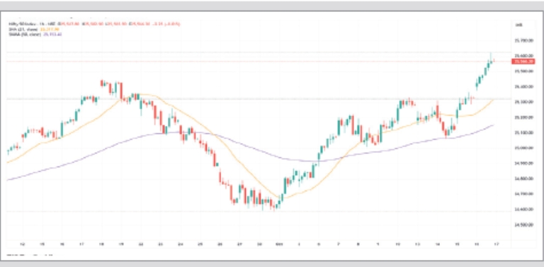 16 ઓક્ટોબરના રોજ, નિફ્ટી 262 પોઈન્ટ (1.03 ટકા) વધીને 25,585 પર પહોંચ્યો, જ્યારે બેંક નિફ્ટી 623 પોઈન્ટ (1.1 ટકા) વધીને 57,423 પર પહોંચ્યો હતો. માર્કેટબ્રેડ્થ પોઝિટિવ રહેવા સાથે NSE પર 1,159 ઘટતા શેર સામે કુલ 1,666 શેર વધ્યા હતા.