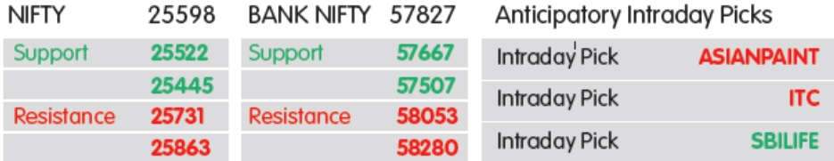 નિફ્ટી 25,600ની નીચે ટકી રહે, તો 25,500-25,400ના લેવલ્સ મુખ્ય સપોર્ટ ઝોન હશે. ઉપરની બાજુએ, 25,750-25,800ના લેવલ્સ પર રેઝિસ્ટન્સનો સામનો કરવો પડી શકે છે, જેની ઉપર 25,600 શક્ય હોઈ શકે છે.