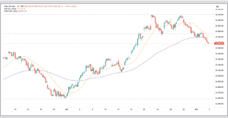 4 નવેમ્બરના રોજ, નિફ્ટી 166 પોઈન્ટ (0.64 ટકા) ઘટીને 25,598 પર પહોંચ્યો હતો. જ્યારે બેંક નિફ્ટી 274 પોઈન્ટ (0.47 ટકા) ઘટીને 57,827 પર પહોંચ્યો હતો. માર્કેટ બ્રેડ્થ નેગેટિવ રહેવા સાથે 1965 શેરમાં ઘટાડો નોંધાયો હતો. જ્યારે 882 શેરમાં ખરીદીનો રસ જોવા મળ્યો હતો.