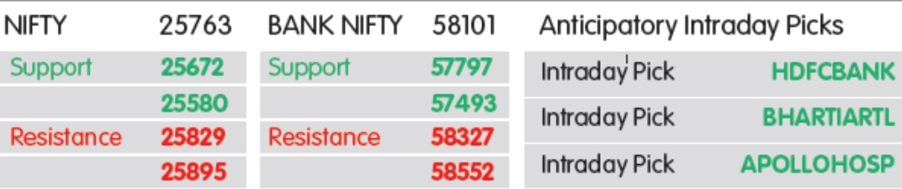નિફ્ટી 25,700–25,600 ઝોનમાં સપોર્ટ સાથે વધુ મજબૂત થવાની અપેક્ષા છે, જ્યારે ઉપરમાં 25,900–26,000 પોઇન્ટના લેવલ્સ પર નજર રાખવાની સલાહ મળી રહી છે. કારણ કે તેનાથી ઉપર ટકી રહેવાથી નિફ્ટી રેકોર્ડ હાઇ તરફ આગળ વધી શકે તેવી સલાહ નિષ્ણાતો આપી રહ્યા છે.