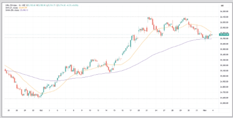 અમદાવાદ, 4 નવેમ્બરઃ નિફ્ટીએ ફરી 25700 પોઇન્ટની ટેકનિકલી સપોર્ટ તેમજ સાયકોલોજિકલ સપાટી પાછી મેળવવા પ્રયાસ કર્યો તે દર્શાવે છે કે, માર્કેટમાં ટોન તેજીનો છે. અંડરટોન મજબૂત શોર્ટટર્મ ટ્રેન્ડ નોંધાવવા સાથે આરએસઆઇ 59 આસપાસ બુલિશ મોમેન્ટમનો સંકેત આપે છે. રિલાયન્સ સિક્યુરિટીઝનો ટેકનિકલ રિસર્ચ રિપોર્ટ સૂચવે છે કે, જો નિફ્ટી 25750 પોઇન્ટનું લેવલ જાળવી રાખે અને એફઆઇઆઇ તેમજ રિટેલ લેવાલી જળવાઇ રહે તો નિફ્ટી નવા હાઇ તરફ આગળ વધે તેવી સંભાવના નકારી શકાય નહિં.