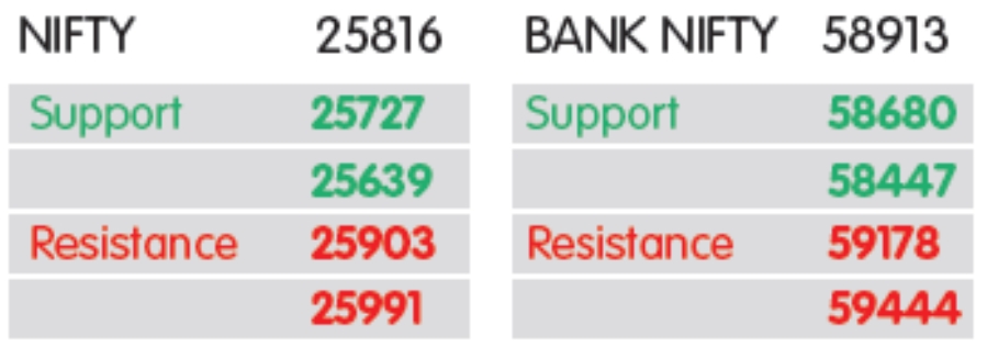 ટેકનિકલ નિષ્ણાતોના મત મુજબ નિફ્ટી માટે ઉપર તરફ, તાત્કાલિક RESISTANCE 25,900-26,000 ઝોનમાં મૂકવામાં આવ્યો છે. આ ઝોનની ઉપર સતત બ્રેકઆઉટ 26,200 તરફનો માર્ગ ખોલી શકે છે, જે અપટ્રેન્ડને મજબૂત બનાવે છે. નેગેટિવ સાઇડ સપોર્ટ 25,700 અને 25,600 પર મજબૂત રહે છે. જ્યાં સુધી નિફ્ટી બંધ ધોરણે 25,500 ના લેવલથી ઉપર રહે છે, ત્યાં સુધી સાવચેતીભરી વ્યૂહરચના સલાહભરી રહે છે, જ્યાં સુધી સ્પષ્ટ બ્રેકઆઉટ અથવા રિવર્સલ ન થાય ત્યાં સુધી સ્ટોપ-લોસ લેવલનું કડક પાલન કરવાની ટ્રેડિંગ સ્ટ્રેટેજી અપનાવવાની સલાહ ટેકનિકલ નિષ્ણાતો આપી રહ્યા છે.