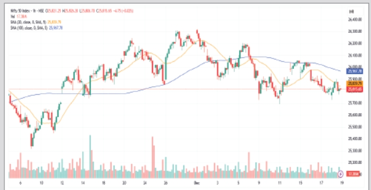 18 ડિસેમ્બરના રોજ, નિફ્ટી 3 પોઈન્ટ ઘટીને 25,816 પર બંધ થયો હતો, જ્યારે બેંક નિફ્ટી 14 પોઈન્ટ ઘટીને 58,913 પર બંધ થયો. બજારમાં મંદીનું પ્રભુત્વ રહ્યું, NSE પર આગળ વધેલા 1,047 શેર સામે લગભગ 1,771 શેર ઘટ્યા હતા.