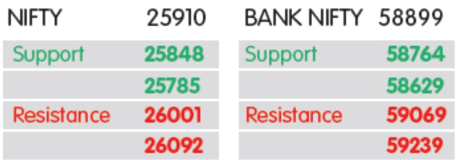જો નિફ્ટી તેના પાછલા દિવસના બોટમ(25,876) ને જાળવી રાખવામાં સફળ થાય, તો આગામી સત્રોમાં 26,000 તરફ રિબાઉન્ડ શક્ય છે, અને ફક્ત આ લેવલથી ઉપર ટકી રહેવાથી જ નિફ્ટીને 26,100ના રેઝિસ્ટન્સ તરફ આગળ વધવા માટે મજબૂતી મળી શકે છે, જ્યારે તાત્કાલિક સપોર્ટ 25,800 પર મૂકવામાં આવ્યો છે.
