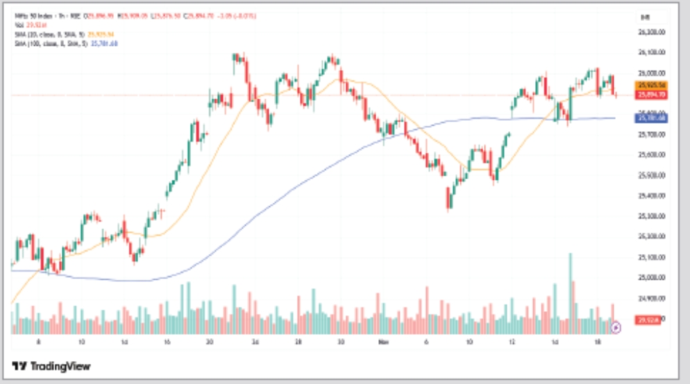 અમદાવાદ, 19 નવેમ્બરઃ મંગળવારે પ્રોફિટ બુકિંગ છતાં, બેન્ચમાર્ક નિફ્ટી અને બેંક નિફ્ટી પોઝિટિવ મોડમાં રહ્યા હતા. જો નિફ્ટી તેના પાછલા દિવસના બોટમ(25,876) ને જાળવી રાખવામાં સફળ થાય, તો આગામી સત્રોમાં 26,000 તરફ રિબાઉન્ડ શક્ય છે, અને ફક્ત આ લેવલથી ઉપર ટકી રહેવાથી જ નિફ્ટીને 26,100ના રેઝિસ્ટન્સ તરફ આગળ વધવા માટે મજબૂતી મળી શકે છે, જ્યારે તાત્કાલિક સપોર્ટ 25,800 પર મૂકવામાં આવ્યો છે. રિલાયન્સ સિક્યુરિટીઝના ટેકનિકલ રિસર્ચ રિપોર્ટ અનુસાર આરએસઆ 60ના લેવલે મજબૂતાઇનો સંકેત આપે છે.