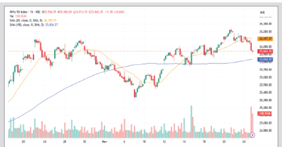 અમદાવાદ, 25 નવેમ્બરઃ નિફ્ટી અને બેંક નિફ્ટીએ મંગળવારે માસિક F&O કરારની સમાપ્તિ પહેલાં સોમવારે સપ્તાહની શરૂઆત પોઝિટિવ ટોન સાથે કરી હતી પરંતુ પાછળથી આવલા પ્રોફીટ બુકિંગે સુધારો ધોવાયો હતો. આગામી સત્રોમાં નિફ્ટી 25,850-26,250 (ગયા સપ્તાહની રેન્જ)ની રેન્જમાં ટ્રેડ થવાની ધારણા ટેકનિકલ એનાલિસ્ટ્સ રાખી રહ્યા છે. બંને બાજુ નિર્ણાયક બ્રેક સ્પષ્ટ દિશા આપી શકે છે, કારણ કે આ રેન્જથી નીચે જવાથી મંદી મજબૂત થઈ શકે છે. દરમિયાન, બેંક નિફ્ટીને 58,600 (ગયા સપ્તાહની બોટમ) થી ઉપર ટકાવી રાખવાની જરૂર છે.