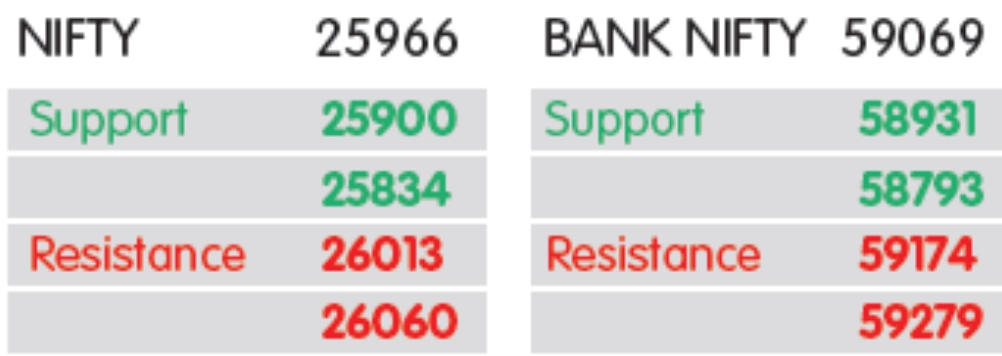 નિફ્ટી માટે તાત્કાલિક રેઝિસ્ટન્સ 26,050–26,100 રેન્જમાં રહેવાની ધારણા છે, કારણ કે આ ઝોનથી ઉપર એક ખાતરીકારક ચાલ રેકોર્ડ હાયર લેવલ તરફ તેજી માટે દરવાજા ખોલી શકે છે, જેમાં 25,800–25,700 મહત્વપૂર્ણ સપોર્ટ તરીકે કાર્ય કરશે.