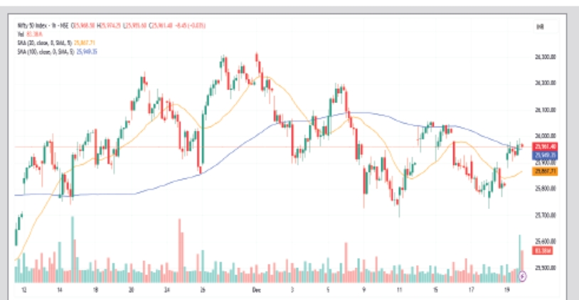 19 ડિસેમ્બરના રોજ, નિફ્ટી 151 પોઈન્ટ (0.58 ટકા) વધીને 25,966 પર બંધ થયો હતો, જ્યારે બેંક નિફ્ટી 156 પોઈન્ટ (0.27 ટકા) વધીને 59,069 પર બંધ થયો હતો. માર્કેટ બ્રેડ્થને બુલ્સ દ્વારા ટેકો મળ્યો, જેમાં NSE પર 848 ઘટતા શેર સામે 1,981 શેર આગળ વધ્યા હતા.