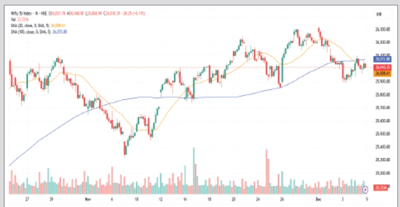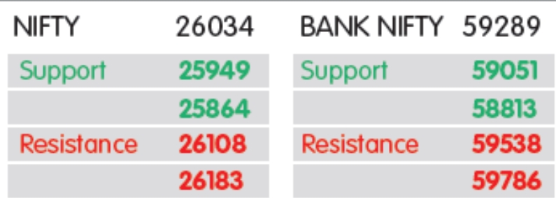 નિફ્ટી સતત પાંચ સત્રોમાં પ્રથમ વખત ફરીથી ઉછળ્યો હતો. જો આગામી સત્રોમાં નિફ્ટી સાયકોલોજિકલ 26,000 લેવલથી ઉપર રહે, તો 26,100–26,200 ઝોન જોવાનું લેવલ હશે, પરંતુ તેનાથી નીચે આવવાથી 25,900–25,800 ઝોન માટે દરવાજા ખુલી શકે છે. દરમિયાન, બેંક નિફ્ટીએ સતત 59,000 પોઇન્ટનો બચાવ કર્યો અને બીજા સત્ર માટે 20 DEMA થી ઉપર રહ્યો.
