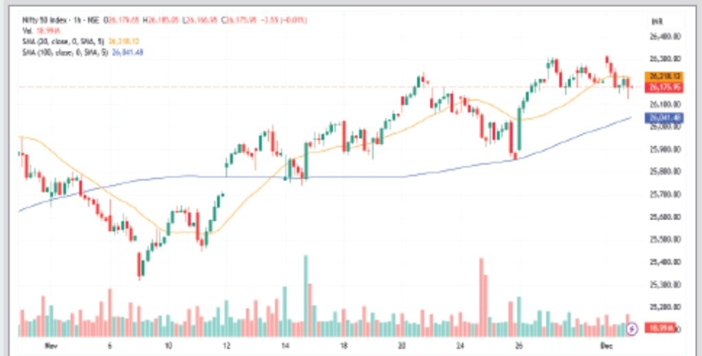 1 ડિસેમ્બરના રોજ, નિફ્ટી 27 પોઈન્ટ ઘટીને 26,176 પર બંધ થયો હતો. જ્યારે બેંક નિફ્ટી 71 પોઈન્ટ ઘટીને 59,681 પર બંધ થયો હતો. માર્કેટ બ્રેડ્થ નેગેટિવ રહેવા સાથે NSE પર કુલ 1,642 શેરમાં ઘટાડો જોવા મળ્યો, જ્યારે 1,219 શેરમાં સુધારો જોવા મળ્યો હતો.