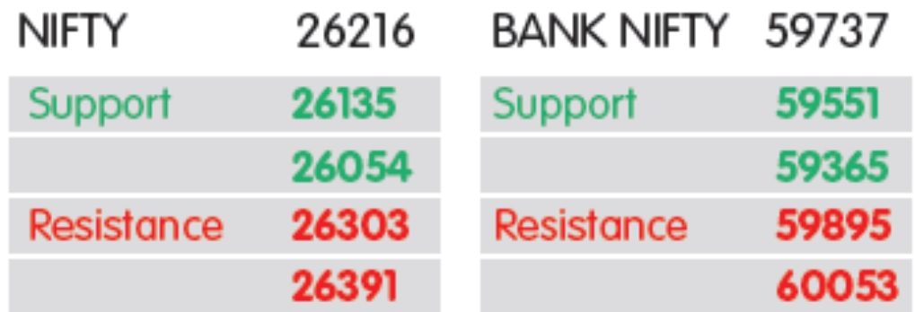 રેકોર્ડ હાઈ ઝોનમાંથી પ્રોફિટ-બુકિંગ છતાં, ટેકનિકલ અને મોમેન્ટમ ઇન્ડિકેટર્સ મજબૂત છે, સાથે સાથે હાયર હાઇ હાયર લો પેટર્ન ચાલુ રહે છે. નિફ્ટી જ્યાં સુધી 26,300થી નીચે ટ્રેડ કરે છે ત્યાં સુધી તે 26,100-26,000 પર સપોર્ટ સાથે કોન્સોલિડેટેડ રહેવાની અપેક્ષા છે. જોકે, 26,300 થી ઉપરની નિર્ણાયક ચાલમાં 26,500 ના સ્તર માટે દરવાજા ખૂલી શકશે. દરમિયાન, બેંક નિફ્ટી 60,000ના સાયકોલોજિકલ લેવલને સ્પર્શ કરવાનો પ્રયાસ કરે તેવી શક્યતા છે. નિષ્ણાતોના મતે, ત્યાં સુધી, 59,500-59,300 ઝોન પર સપોર્ટ સાથે રેન્જબાઉન્ડ ટ્રેડિંગ ચાલુ રહી શકે છે.