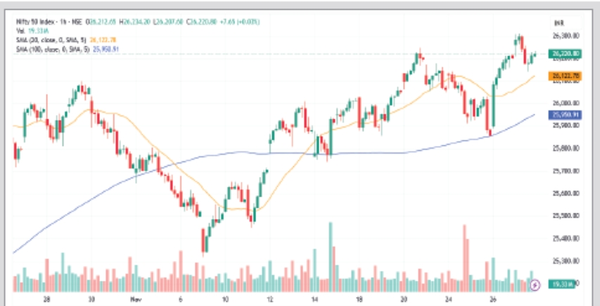અમદાવાદ, 28 નવેમ્બરઃ નિફ્ટી ગુરુવારે સાધારણ સુધારા સાથે બંધ રહ્યો છતાં માર્કેટબ્રેડ઼્થ નેગેટિવ રહી હતી. હાલમાં પ્રાઇસ એક્શન 26600- 26000ની ટ્રેડિંગ રેન્જમાં ઘૂંટાયેલી જણાય છે. 20 દિવસીય સિમ્પલ મૂવિંગ એવરેજ લાઇન ધીમાં સુધારાનો સંકેત આપે છે.