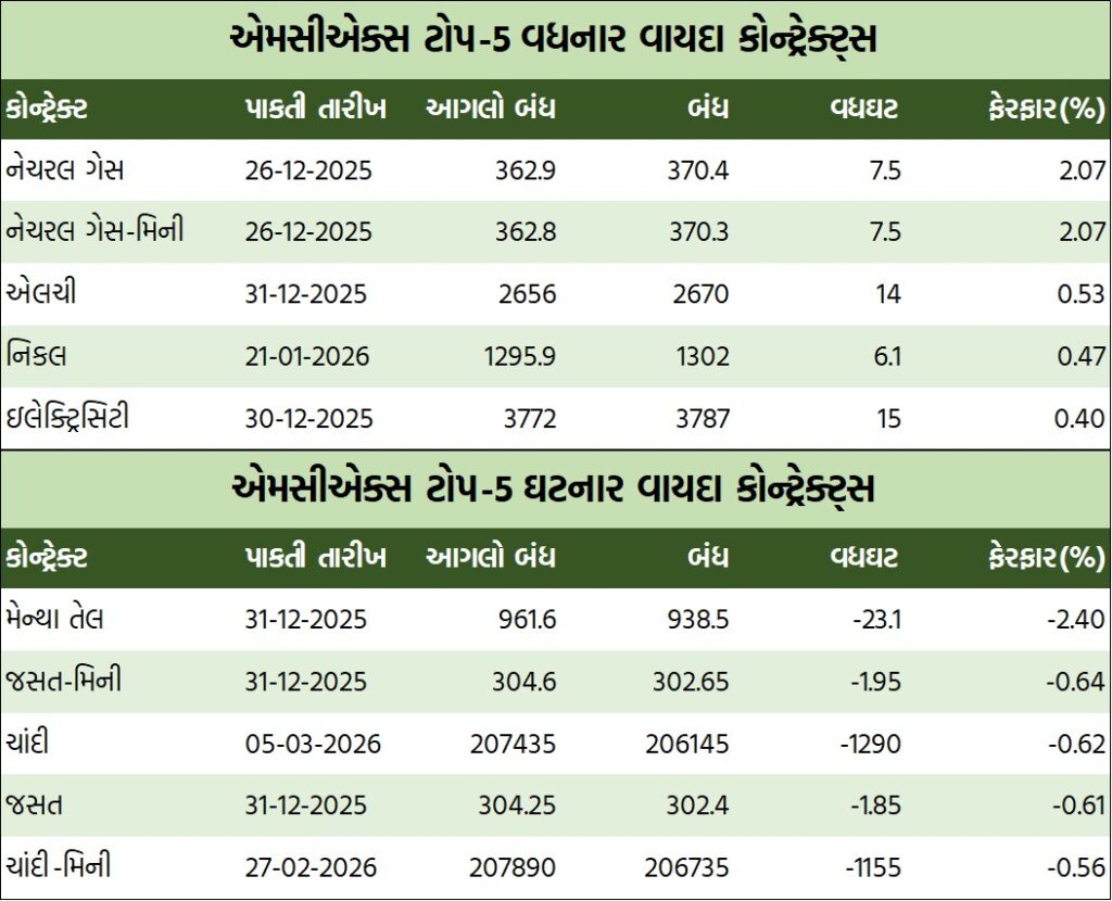 સોનાના વિવિધ વાયદાઓમાં રૂ. 7465.92 કરોડ અને ચાંદીના વિવિધ વાયદાઓમાં રૂ. 10274.79 કરોડનાં કામકાજ થયાં હતાં. તાંબાંના વાયદાઓમાં રૂ. 1246.58 કરોડ, એલ્યુમિનિયમ અને એલ્યુમિનિયમ-મિનીના વાયદાઓમાં રૂ. 82.43 કરોડ, સીસું અને સીસું-મિનીના વાયદાઓમાં રૂ. 14.92 કરોડ, જસત અને જસત-મિનીના વાયદાઓમાં રૂ. 210.18 કરોડનાં કામકાજ થયાં હતાં.