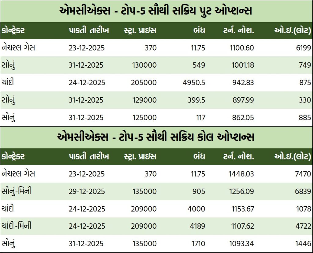 સોનું ડિસેમ્બર રૂ.130000ની સ્ટ્રાઇક પ્રાઇસવાળો પુટ ઓપ્શન 10 ગ્રામદીઠ રૂ.89 વધી રૂ.549 થયો હતો. આ સામે ચાંદી ડિસેમ્બર રૂ.205000ની સ્ટ્રાઇક પ્રાઇસવાળો પુટ ઓપ્શન કિલોદીઠ રૂ.334 વધી રૂ.4993ના ભાવે બોલાયો હતો. તાંબું ડિસેમ્બર રૂ.1100ની સ્ટ્રાઇક પ્રાઇસવાળો પુટ ઓપ્શન કિલોદીઠ 44 પૈસા વધી રૂ.8.57ના ભાવે બોલાયો હતો. જસત ડિસેમ્બર રૂ.295ની સ્ટ્રાઇક પ્રાઇસવાળો પુટ ઓપ્શન કિલોદીઠ 42 પૈસા વધી રૂ.1.6ના ભાવે બોલાયો હતો.