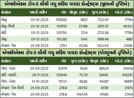 નેચરલ ગેસ અને નેચરલ ગેસ-મિનીના વાયદાઓમાં રૂ.1837.03 કરોડનાં કામ થયાં હતાં. મેન્થા તેલના વાયદામાં રૂ.5.77 કરોડનાં કામ થયાં હતાં. એલચીના વાયદામાં રૂ.0.90 કરોડનાં કામ થયાં હતાં. ક્રૂડ તેલના વાયદાઓમાં 14849 લોટ, નેચરલ ગેસના વાયદાઓમાં 28528 લોટના સ્તરે રહ્યો હતો. ક્રૂડ તેલ સપ્ટેમ્બર રૂ.5500ની સ્ટ્રાઇક પ્રાઇસવાળો કોલ ઓપ્શન બેરલદીઠ રૂ.25.3 વધી રૂ.130.5ના ભાવે બોલાયો હતો. જ્યારે નેચરલ ગેસ સપ્ટેમ્બર રૂ.280ની સ્ટ્રાઇક પ્રાઇસવાળો કોલ ઓપ્શન એમએમબીટીયૂદીઠ રૂ.2.4 વધી રૂ.11.35ના ભાવે બોલાયો હતો.
