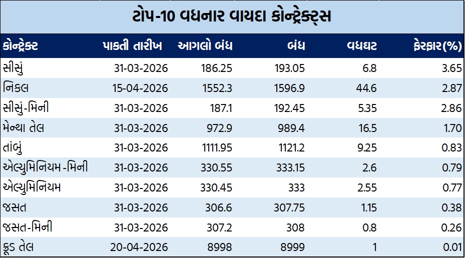 સોનાના વિવિધ વાયદાઓમાં રૂ.224949.13 કરોડ અને ચાંદીના વિવિધ વાયદાઓમાં રૂ.102582.43 કરોડનાં કામકાજ થયાં હતાં. તાંબાંના વાયદાઓમાં રૂ.30371.36 કરોડ, એલ્યુમિનિયમ અને એલ્યુમિનિયમ-મિનીના વાયદાઓમાં રૂ.3228.71 કરોડ, સીસું અને સીસું-મિનીના વાયદાઓમાં રૂ.131.15 કરોડ, જસત અને જસત-મિનીના વાયદાઓમાં રૂ.2541.41 કરોડનાં કામકાજ થયાં હતાં.
