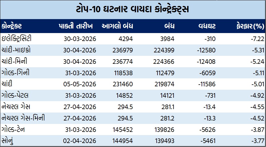 ચાંદીના વાયદાઓમાં ચાંદી મે વાયદો સપ્તાહના પ્રારંભે કિલોદીઠ રૂ.239948ના ભાવે ખૂલી, સપ્તાહ દરમિયાન ઇન્ટ્રા-ડેમાં ઉપરમાં રૂ.240000 અને નીચામાં રૂ.199643ના મથાળે અથડાઈ, રૂ.231460ના આગલા બંધ સામે સપ્તાહના અંતે રૂ.11586 ઘટી રૂ.219874ના સ્તરે પહોંચ્યો હતો. સપ્તાહના અંતે કિલોદીઠ ચાંદી-મિની એપ્રિલ વાયદો રૂ.12408 ઘટી રૂ.224366 થયો હતો. ચાંદી-માઇક્રો એપ્રિલ વાયદો રૂ.12580 ઘટી રૂ.224399ના ભાવે સપ્તાહના અંતે બંધ થયો હતો.