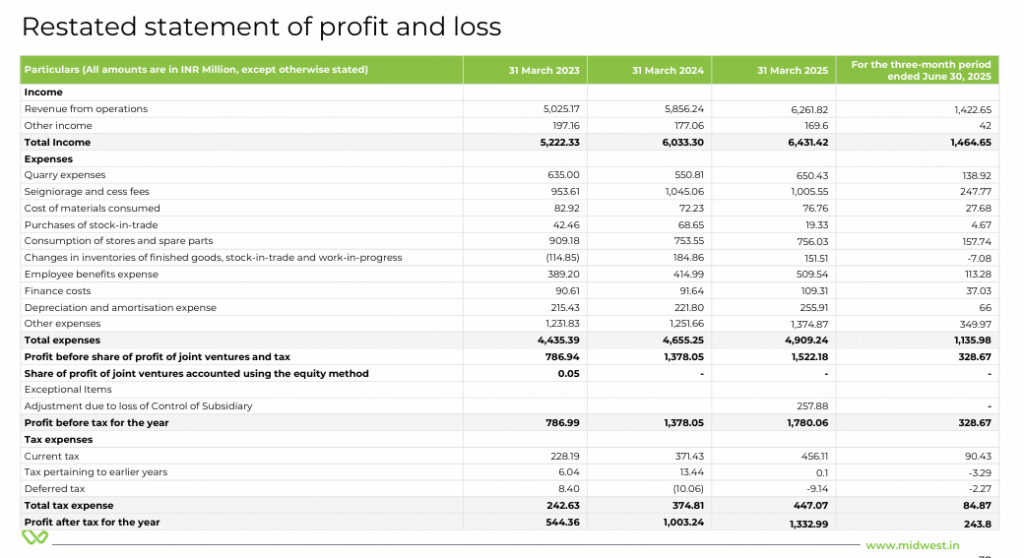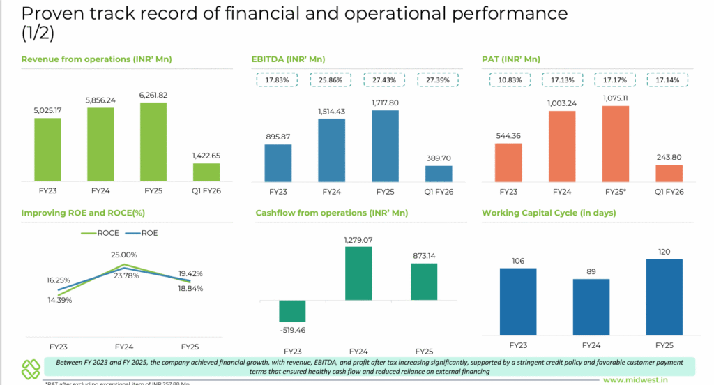 મિડવેસ્ટ લિમિટેડ તેલંગાણા અને આંધ્રપ્રદેશમાં 16 ગ્રેનાઈટ ખાણો ચલાવે છે, જે પ્રીમિયમ બ્લેક ગેલેક્સીનું ઉત્પાદન કરે છે – જે ફક્ત આંધ્રપ્રદેશના એક જ ગામમાં જોવા મળે છે – અને એબ્સોલ્યુટ બ્લેક ગ્રેનાઈટ, બંનેનો વ્યાપકપણે વૈશ્વિક રિયલ એસ્ટેટ પ્રોજેક્ટ્સમાં ઉપયોગ થાય છે. નાણાકીય વર્ષ 2023 અને નાણાકીય વર્ષ 2025 વચ્ચે, કંપનીએ આવકમાં 11.63%, EBITDA માં 38.47% અને PAT માં 40.53% નો CAGR નોંધાવ્યો. નાણાકીય વર્ષ 2025 માટે, ચોખ્ખો નફો 33% વધીને રૂ. 133.3 કરોડ થયો, જ્યારે આવક વધીને રૂ. 626.2 કરોડ થઈ.