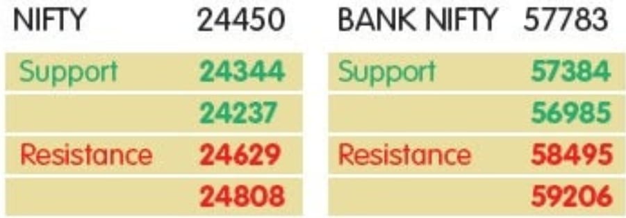 નિફ્ટીનો સપોર્ટ લેવલ 24237-24344 અને રેઝિસ્ટન્સ લેવલ 24629-24808 છે. બેન્ક નિફ્ટી માટે પણ 57384નો સપોર્ટ લેવલ નિર્ધારિત કરવામાં આવ્યો છે. જો આ લેવલ તોડ્યું તો લાર્જ બેરિશ કેન્ડલ બની શકે છે.