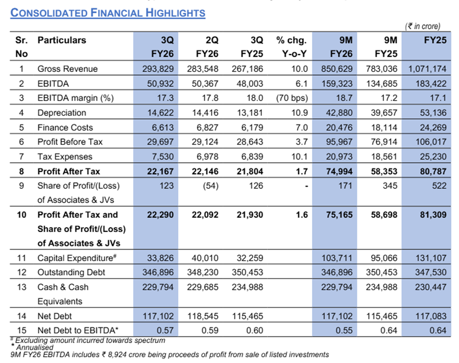 | 2026ના નવ મહિનાનો એકીકૃત EBITDA રૂ.૧,૫૯,૩૨૩ રહ્યો, (Y-o-Y) ૧૮.૩% નો વધારો | PAT (કરવેરા પછીનો નફો) રૂ.૭૫,૧૬૫ રહ્યો, જે વાર્ષિક ધોરણે ૨૮.૧% નો વધારો દર્શાવે છે |