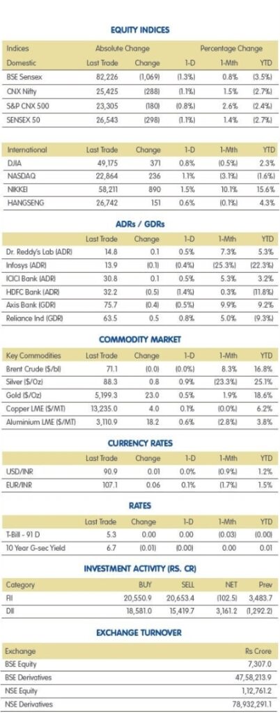 24 ફેબ્રુઆરીના રોજ, NIFTY 50 288 પોઈન્ટ (1.12 ટકા) ઘટીને 25,425 પર પહોંચ્યો હતો, જ્યારે બેંક NIFTY 217 પોઈન્ટ (0.35 ટકા) ઘટીને 61,047 પર પહોંચ્યો હતો. માર્કેટ બ્રેડ્થ નેગેટિવ રહેવા સાથે NSE પર 835 શેર સુધર્યા હતા તેની સરખામણીમાં લગભગ 2,102 શેર ઘટ્યા હતા.